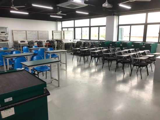 变速器拆装与检测实训室现有大众01JCVT无级变速器实物解剖模型1台、大众DSG变速器实物解剖模型1台、丰田A340E变速器实物解剖模型1台、大众01N自动变速器实训台2台、大众01N自动变速器拆装运行实训台1台、丰田A340E自动变速器拆装台4台、01N自动变速器拆装台8台、01V自动变速器拆装台2台以及其他各种检测设备。