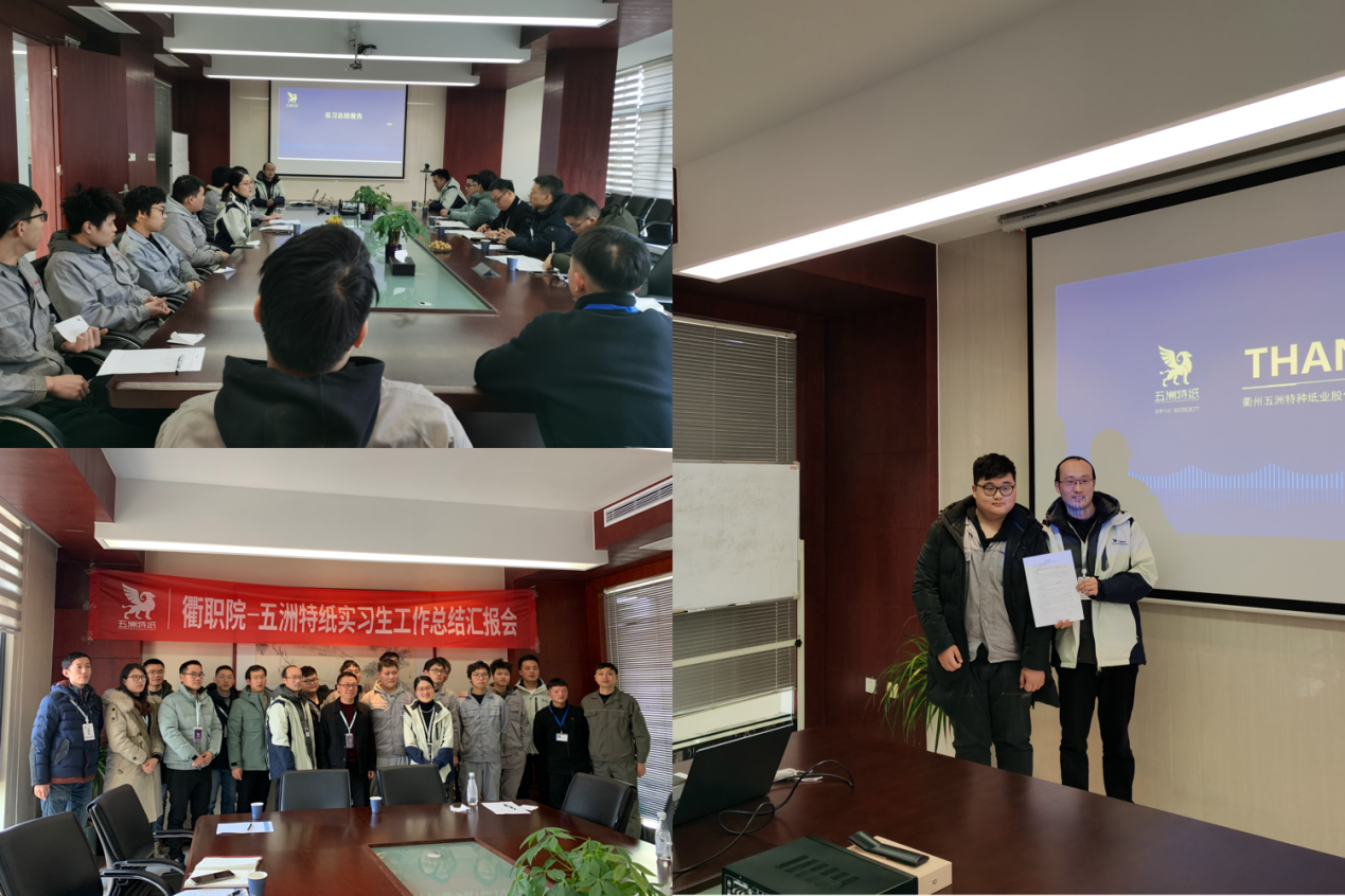 首先由在岗实习员工汇报实习情况,实习员工统一着装,精神饱满,通过PPT展示,就各自在工作、技能提升、沟通能力和生活畅所欲言。汇报结束后,校企双方就接下来人才培养、毕业生留衢发展的具体举措深入交换了意见。校方感谢企业提供实习岗位,利用“传帮带”模式促进员工全面发展,肯定员工在岗期间综合能力的提升;同时希望通过跟岗实习的方式加强校企双方合作力度,共同营造留住人才的良好环境。企业结合自身快速发展的需求,望尽快与太阳成集团122ccvip达成长期密切合作,在“点”的努力基础上扩大到“面”的发展,通过开办“五洲特纸班”,将留住人才持续做下去。