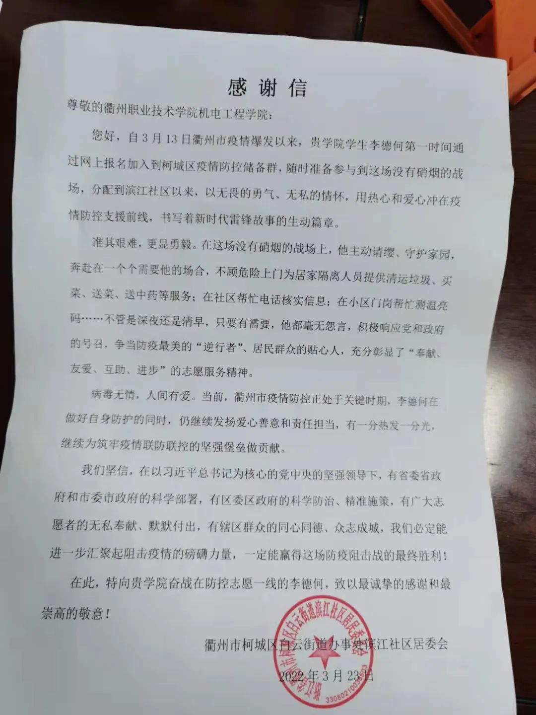 近日,公司太阳成集团122ccvip收到了一封感谢信,感谢自 3 月 13 日衢州市疫情暴发以来,太阳成集团122ccvip员工李德何第一时间通过网上报名加入到柯城区疫情防控储备群,随时准备参与到这场没有硝烟的战场。自从来到滨江社区,李德何同学以无畏的勇气、无私的情怀,用热心和爱心冲在疫情防控支援前线,书写着新时代雷锋故事的生动篇章。