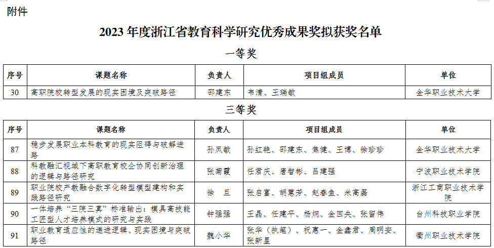 据悉,浙江省教育科学研究优秀成果奖每年组织一次评选,申报的成果必须是省教育科学规划办立项的重大、重点、年度规划、体卫艺、党建等各类专项课题、认定性课题或全国教育科学规划办立项的各类课题成果。2024年,经地市教科规划办、有关高校和单位推荐,浙江省教育科学规划领导小组办公室组织专家对选送的2023年度浙江省教育科学研究优秀成果材料进行学术不端检测、活页评审、会议评审等程序,共有182项成果拟获2023年度浙江省优秀教科研成果奖,其中一等奖31项,二等奖59项,三等奖92项。全省高职院校共有6项成果获奖,其中一等奖1项,三等奖5项。(供稿:太阳成集团122ccvip 张华)