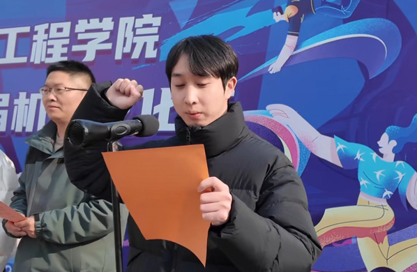 管圣欢同学代表全体参赛者庄严宣誓。他承诺严格遵守比赛规则,珍视比赛机会,努力拼搏,公平竞争,展示出真实的技能和水平,树立机电新青年的良好形象。