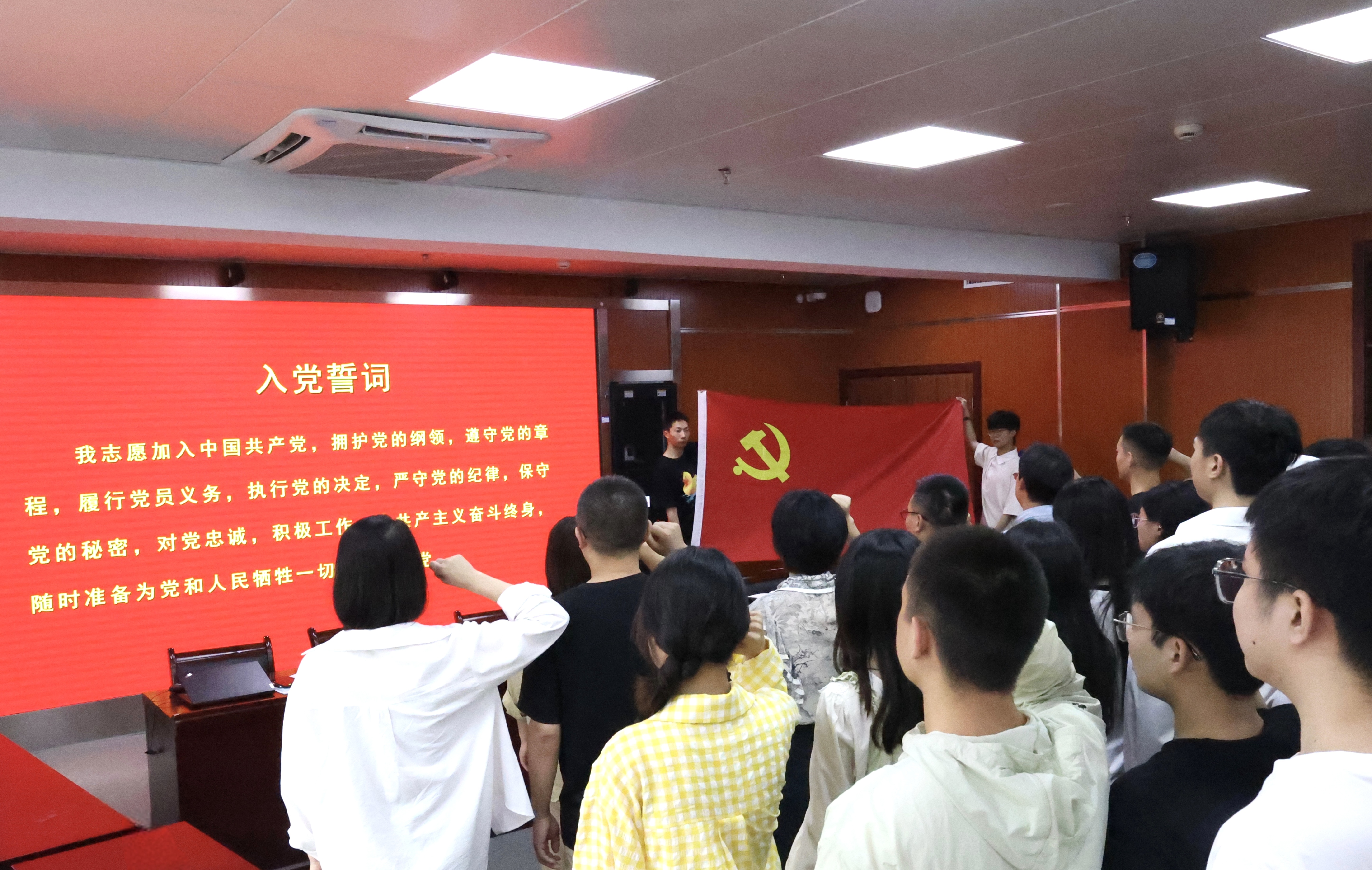 座谈会伊始,全体师生党员起立,面向党旗,在叶云霞副书记的领读下,重温入党誓词,庄严的誓词在会议室回荡,激励着每一位党员同志不忘初心,牢记使命。