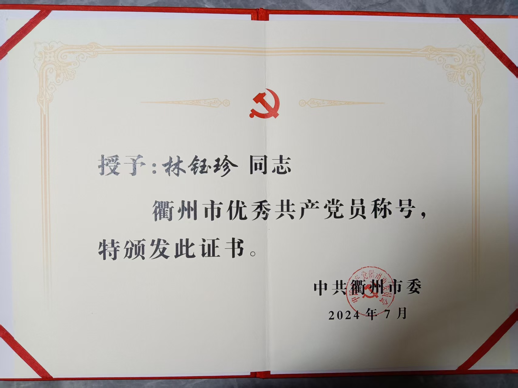近日,在全市范围内开展的优秀共产党员评选活动中,支部书记林钰珍同志凭借其在党建工作中的卓越表现和突出成绩,荣获市级“优秀共产党员”称号。