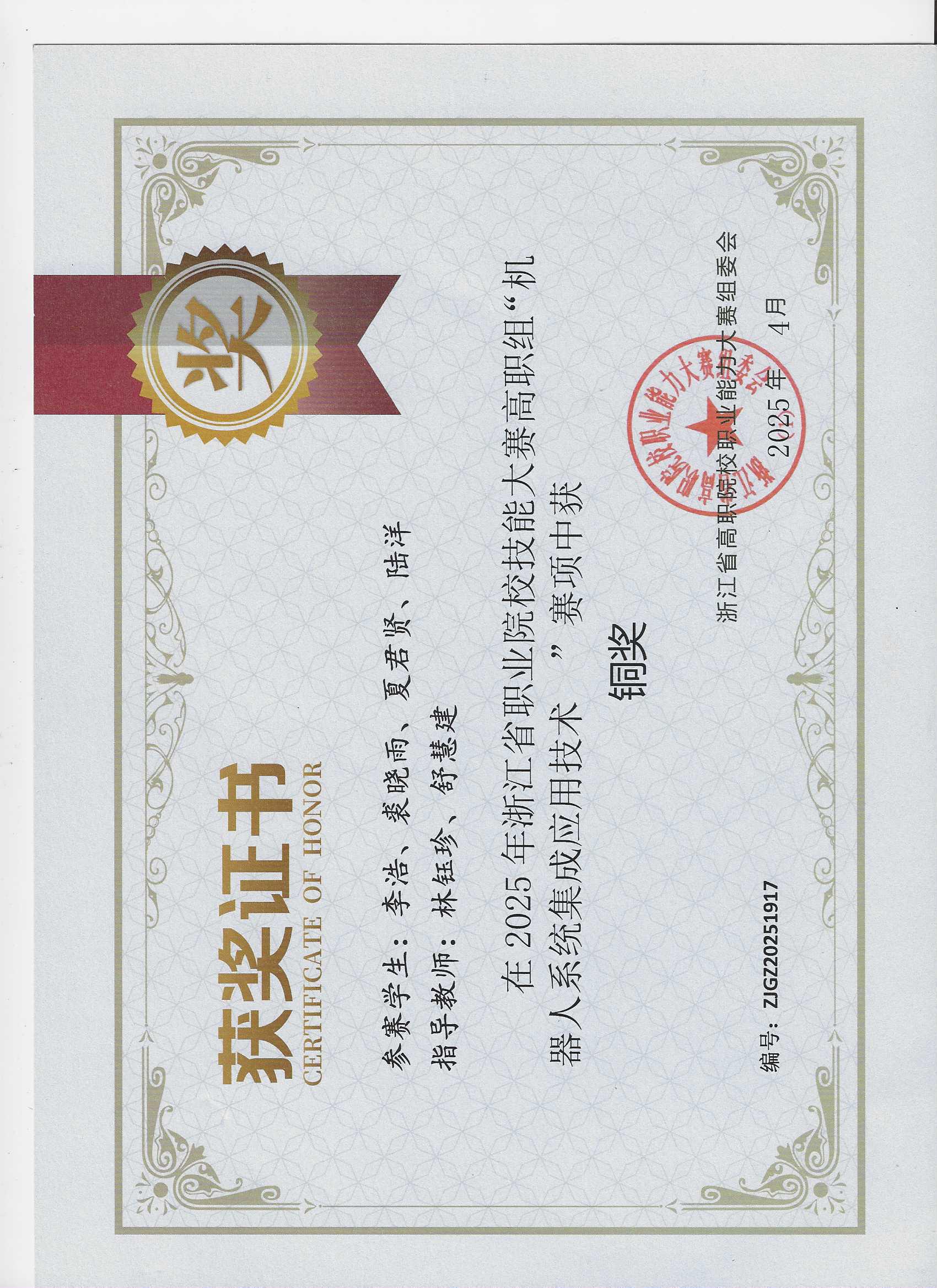 支部党员教师林钰珍、舒慧建指导,23机器人专业员工李浩、裘晓雨和24机制专业员工夏君贤、陆洋参与的赛项“机器人系统集成应用技术”获铜奖。