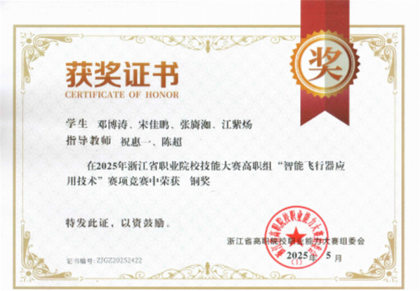 支部党员教师祝惠一、陈超指导,23机器人专业员工邓博涛、宋佳鹏、张旖洳、江紫炀参与的赛项“智能飞行器应用技术”获铜奖。