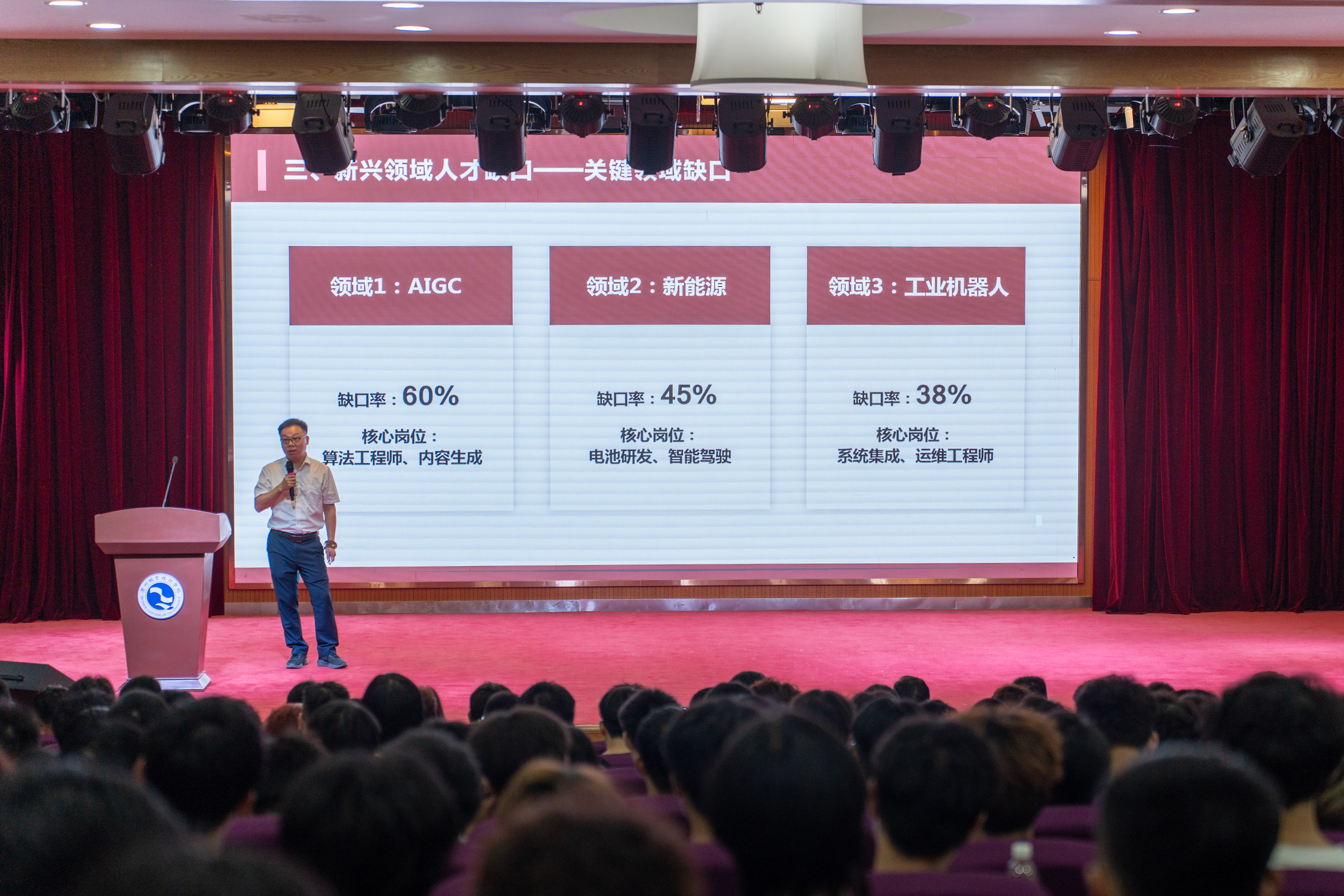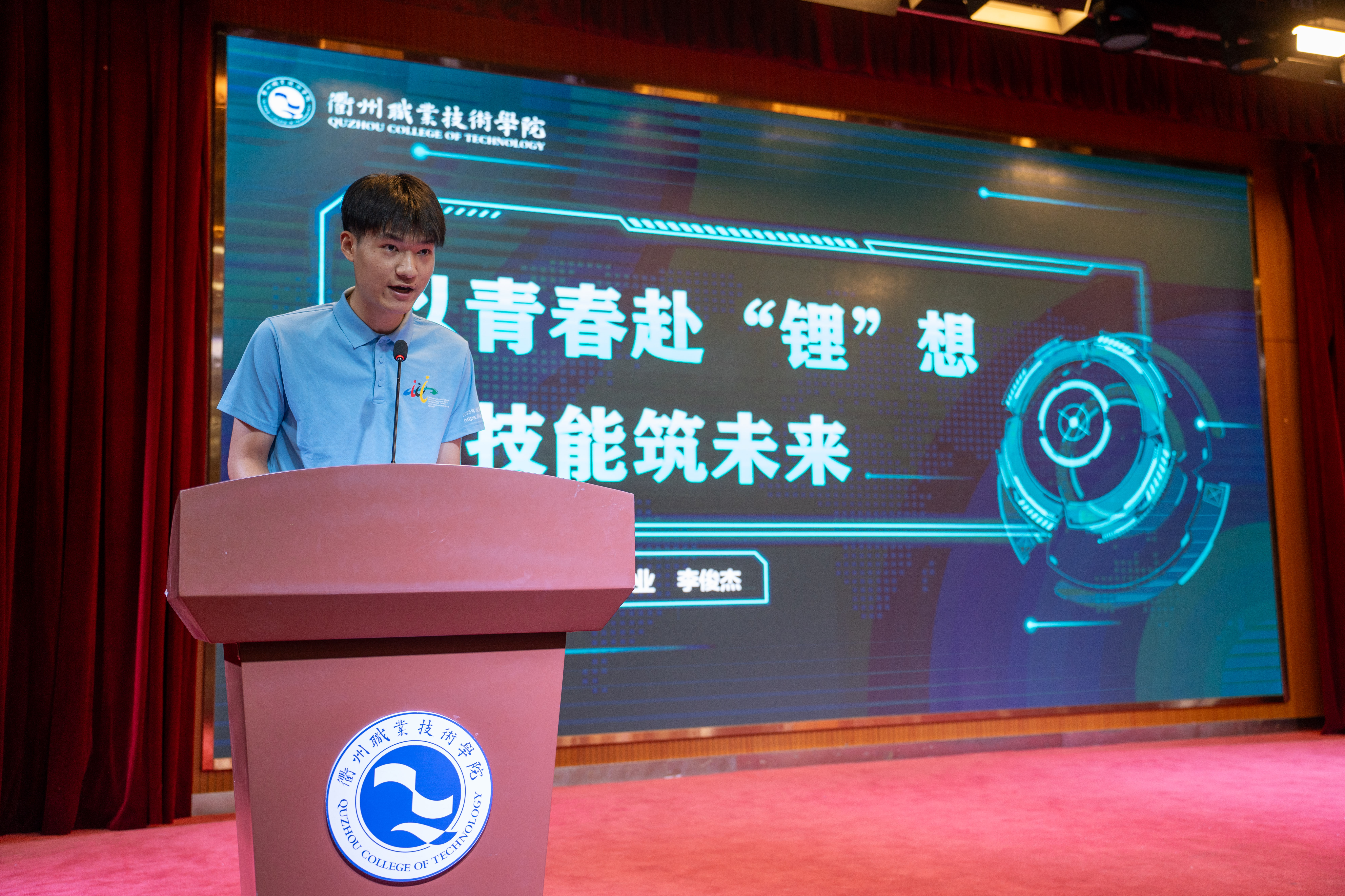 公司24级优秀学子李俊杰也上台分享经验,他讲述了自己与团队在世界职业院校技能大赛中奋力拼搏、斩获金牌的历程,并从“勇敢尝试新事物”“专注专业学业”“积极融入集体”“坚定理想信念”四个方面为学弟学妹们提出建议,强调掌 握实用技能对未来发展的重要性。
