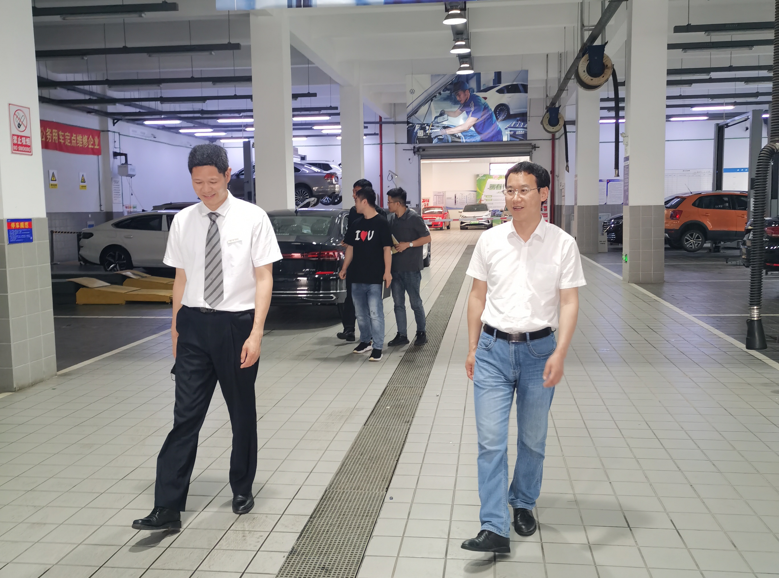 培训结束后,浙江中通汽车销售服务有限公司刘经理带领党员同志参观介绍了公司售前和售后各个部门运营情况,刘经理与魏经理围绕企业用工需求、技能人才培养需求等情况进行深入交流。