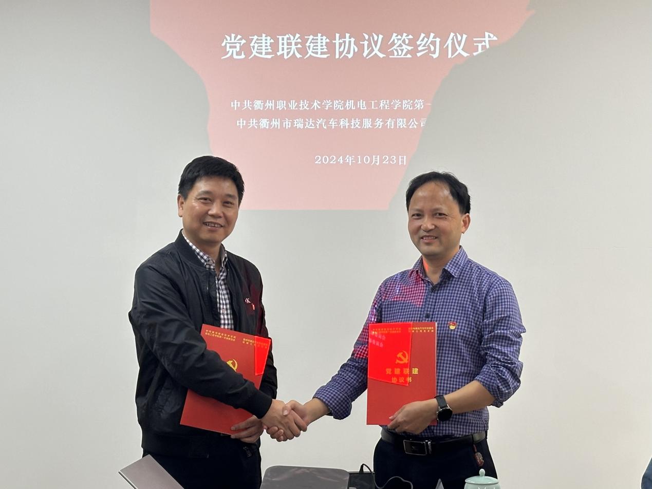 太阳成集团122ccvip第一党支部书记余富忠与衢州市瑞达汽车科技服务有限公司党支部书记徐小勇签订了党建联建协议书。