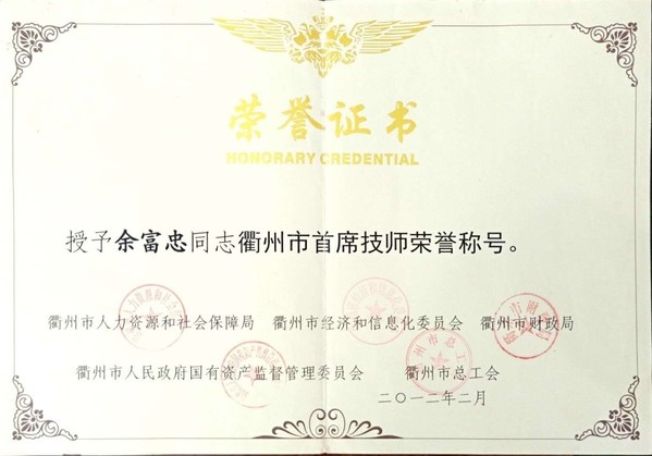 余富忠被授予“衢州市首席技师”荣誉称号