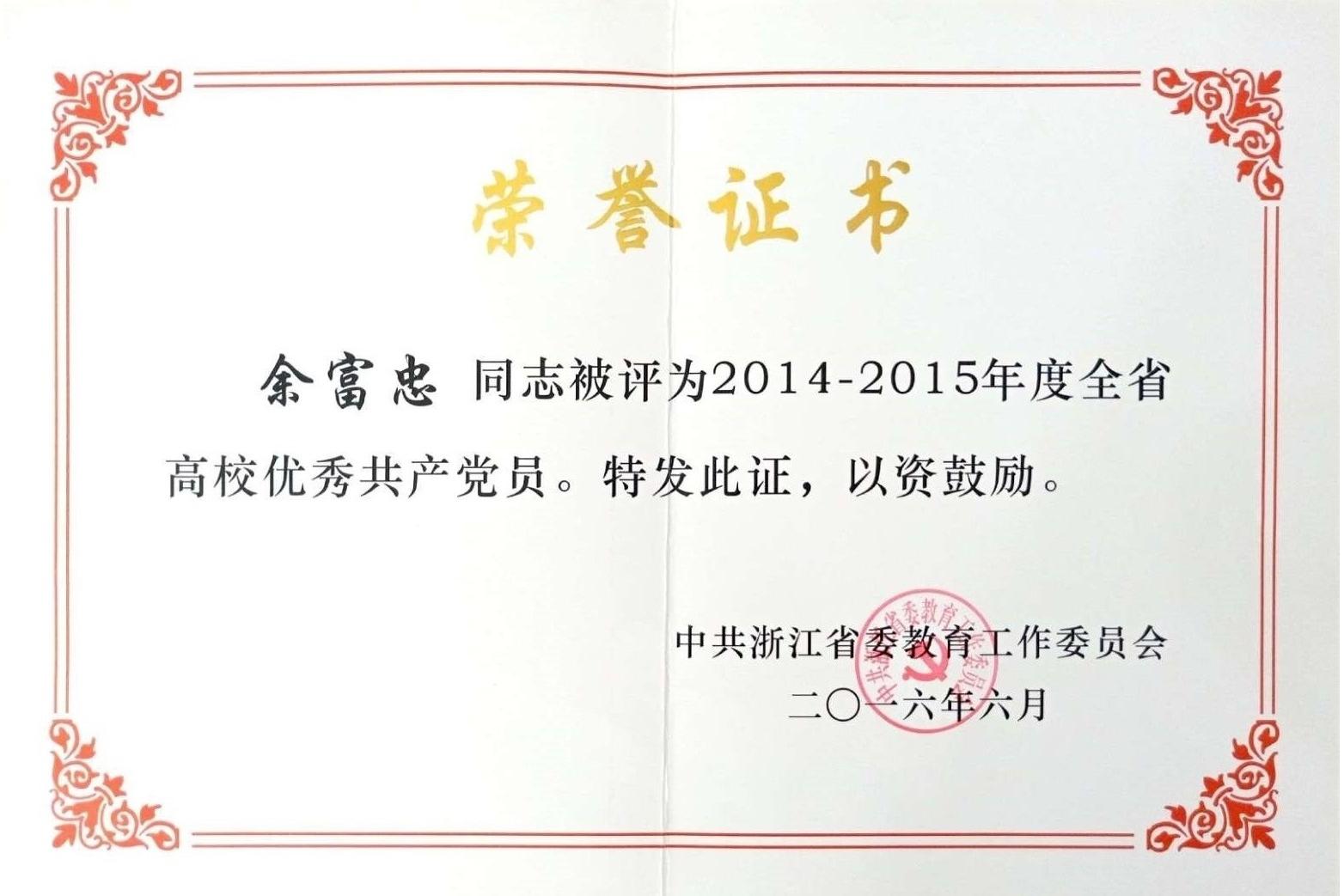 余富忠被评为2014-2015年度全省高校优秀共产党员