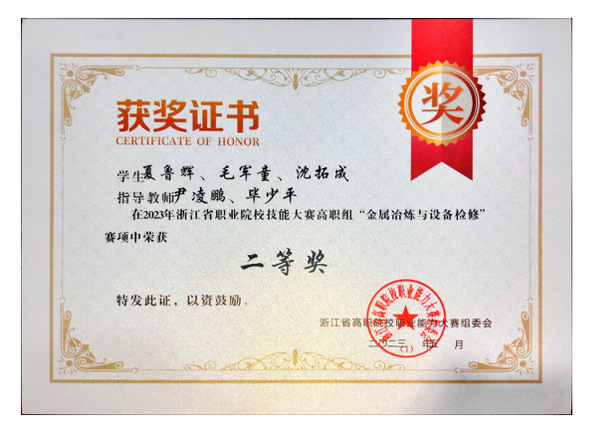 毕少平指导员工获2023年浙江省高职员工技能大赛金属冶炼与设备检修项目二等奖